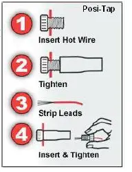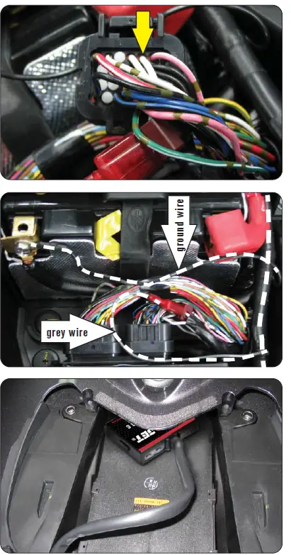 - Using the supplied Posi-tap, secure the GREY wire from the PC6 to the WHITE wire of the ECU as shown. This wire is from the smaller of the two ECU connectors in position fi ve. The wire location is numbered on the back of the connector.