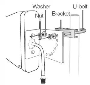 closest cell tower go to www.cellreception.com. To install the outside antenna, assemble the u-bolt, bracket, nuts and washers as shown in the illustration. Keep the connections loose enough to allow the antenna to rotate until the optimum direction is found. Note: The outside antenna may be installed on a variety of pipe angles. Ensure that the mounting area has at least a 12-inch radius clear of obstructions and other radiating elements and orient the antenna vertically with the drip hole at the bottom. Once the outside antenna is secured to a pipe or pole, connect one end of the provided 50 ft. coax cable to the antenna and tighten the connection.