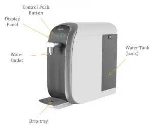 Compact design, no plumbing required, simply plug the SimPure® Y7 Countertop Water Purification System into an electrical outlet and fill with potable (tap) water to be purified. Push the control button to dispense.