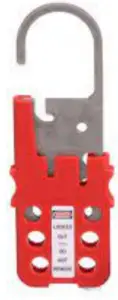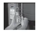 Insert up to six padlocks and tags into holes of the hasp. Verify that the lockout device secures the disconnect switches in a safe or off position.