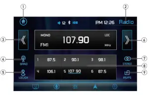 Radio Operation | Select the Radio icon from the Main Menu screen. Press to return to Main Menu screen. Displays current mode of operation. Press and hold << to seek a lower frequency. Press << momentarily to tune the unit down one step at a time. Press between 2 AM and 3 FM bands. Press to toggle between Local and Distance tuning. Press and hold >> to seek a higher frequency. Press >> momentarily to tune the unit up one step at a time. Press to toggle between Stereo and Mono tuning. Press and hold to set the current station in that preset spot. Press momentarily to recall the desired preset and begin playback. Press to scan presets and listen to the first 10 seconds of each. Press again to stop scanning and listen to the station. Press and hold to automatically find and store the strongest stations as presets. |