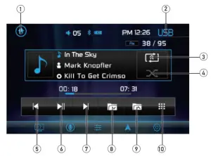 Dimmer 9 | Press to dim the display. Press to adjust Audio options. Press to access the Settings menu. Press to access Bluetooth Phone (from Music mode). Press to access Bluetooth Music (from Phone mode). Press to go back to the previous file or track. Press to pause or resume playback. Press to advance to the next file or track. |