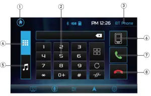 Preparation | Before you can use a Bluetooth device, it must be paired and connected. Make sure that Bluetooth is activated on your device before you begin the pairing process. The unit broadcasts the pairing signal constantly when no devices are currently connected. Complete the pairing sequence from your Bluetooth device. Refer to the owner’s manual for your device for more details. The device name is “CMR270”. The Bluetooth passcode is “0000”. The unit can be in any mode of operation when pairing is performed. On certain phones, pairing may need to be done more than once. Most Bluetooth devices support the auto-connect feature and will connect automatically if the device is in range when the unit is powered-on. If your device was previously paired but does not connect, enter the Bluetooth setup menu and turn Auto Connect on. To access the phone, select Bluetooth Phone from the Main Menu or press the phone icon from any operational mode. Press to return to the Main Menu screen. Use the phone keypad to dial the desired phone number. Alternately, numbers can be dialed directly from the phone. Displays current mode of operation. Press to access Bluetooth phone. Press to access Bluetooth music. Press to view a list of available devices. Press to connect a call. Press to end a call |