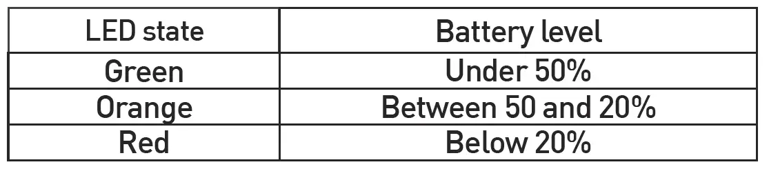 In order to know the battery level, a simultaneous short press on O and + must be performed. The LED will display the battery level ccording to below table:
