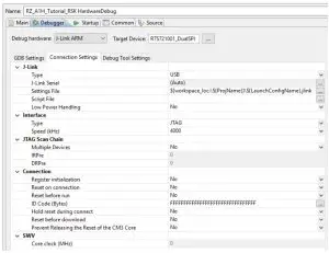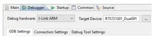 - In the ‘Debugger’ tab, verify that the ‘Debug hardware’ selected is ‘J-Link ARM’ and the ‘Target Device’ is R7S721001_DualSPI