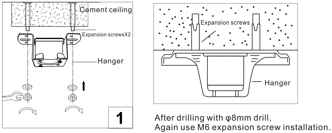 - Use 8 mm impact drill bit to drill 50 mm depth for concrete ceiling, then use lamp fitting The expansion screw in the bag fixed the hanger to the ceiling.