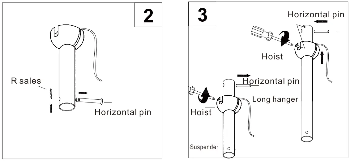 - Select the appropriate length of the suspender according to the height of the ceiling board; this ceiling fan is equipped with a suspender length of 5 inches.if not in accordance with the use of the suspender Please contact our company forother sizes of suspenders, replacement suspenders, suspenders replacement as shown in steps 2,3.