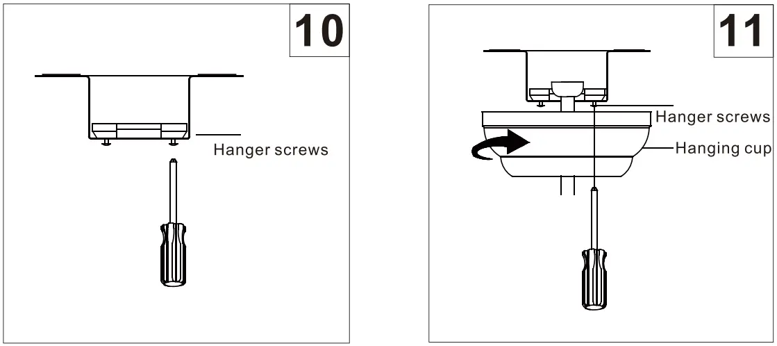 - Align the cup notch to the screw on the hanger, then lift the cup up so that the screw passes through the cup notch, Then rotate from right to left, and fasten the two screws of the cup with screwdriver. as shown in step 11.