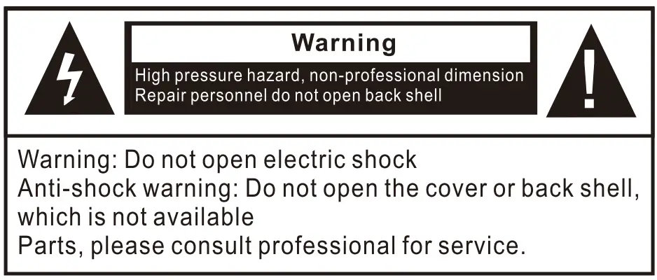 This machine has the end insulation “dangerous high voltage”, in order to avoid electric shock non-professional maintenance personnel, Do not remove the lid or rear plate without authorization.