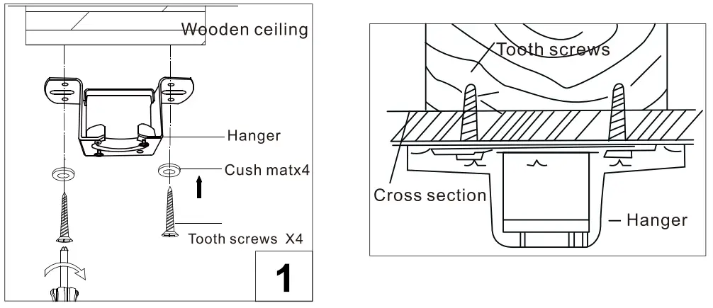 - mounted on wooden ceiling board, drill the hanger on wooden square or beam with wooden tooth screw. (Wood ceiling thickness not less than 10 mm)