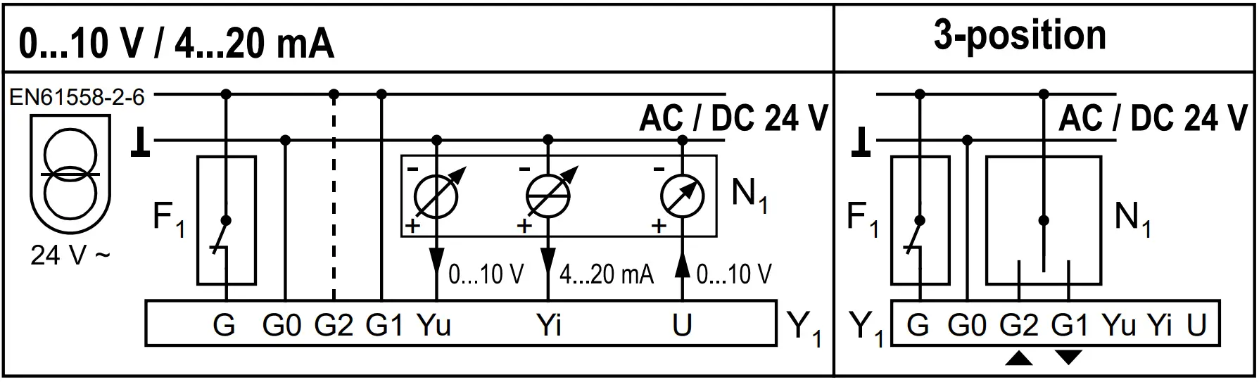 | Spring return function (System potential) | System neutral | 0V = Tappet extended (System potential) | 0V = Tappet retracted (System potential) | Control signal 0…10 V / 4…20 mA | Position indication |