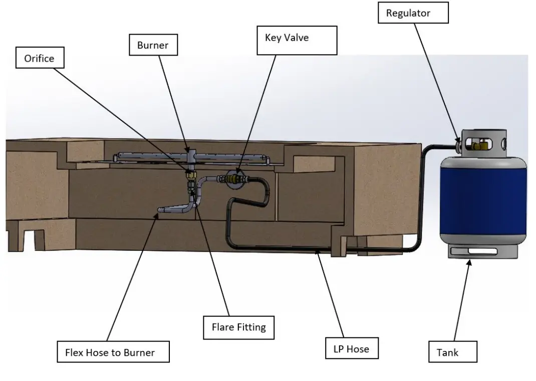 Make sure the foundation is flat and level prior to placement. Units that use liquid propane will come with a burner, orifice, flex hose, and regulator that will attach to the propane tank. This gas hose will need to go from the tank to the burner. The hose should connect from the key valve within the unit, through a vent underneath, and to the propane tank. Make sure all fittings are tightened properly with a wrench, do not hand tighten! An additional flex hose will be attached to the other end of the key valve to the flare fitting at the bottom of the burner. The arrow on the key valve should be pointing in the direction of the gas flow (towards the burner plate on your fire feature).
