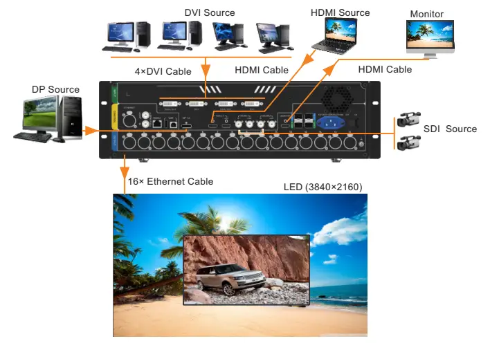 | Ethernet port | 16 | 16 × Neutrik Gigabit Ethernet output connectors, allowing for a loading capacity up to 10,400,000 pixels Maximum resolution supported: Max. width: 16K. Max. height: 8K |