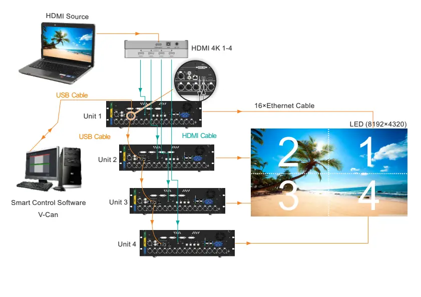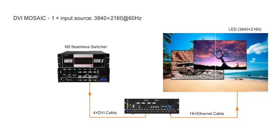 When 4 NovaPro UHD Jr units are used together for image mosaic, the total pixels of the LED screen are 7680×4320.