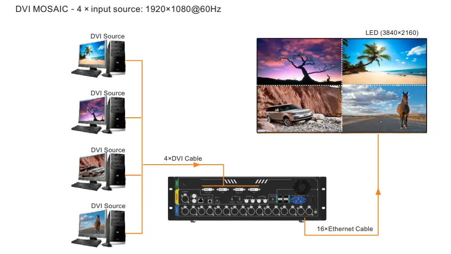 4 | – Four DVIs are all single-link DVI connectors by default. Each DVI: Input resolution up to 1920×1200@60Hz, downward compatible Four single-link DVI input sources constitute one input source (DVI MOSAIC). – In dual-link mode, DVI 1 and DVI 3 are dual-link DVI connectors while DVI 2 and DVI 4 are unavailable. DVI 1/DVI 3: Input resolution up to 3840×1080@60Hz, downward compatible Maximum resolution supported: Max. width: 2048. Max. height: 2048 |