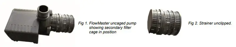 The FlowMaster 3500 and 4500 is provided with a secondary strainer cage attached. This provides a filter/guard to prevent debris from entering the pump unit; this sits in front of your pump’s impellor.