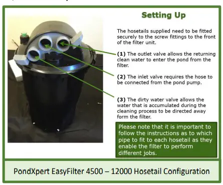 - The last hosetail; the outlet allows the cleaned water to re-enter the pond. This can either be straight to the main pond via a hose or a waterfall.