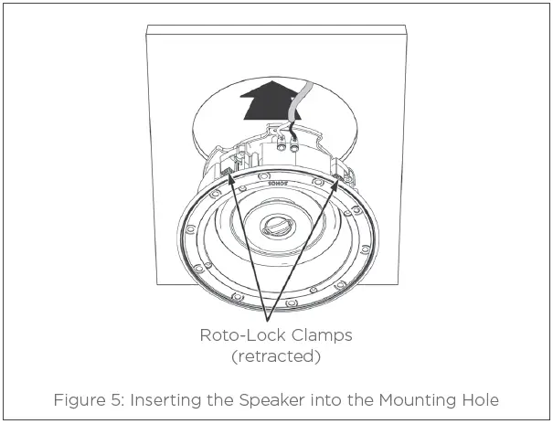 - Make sure all the Roto-Lock toggle feet are retracted so that they are tucked within the mounting hole’s border. Insert the speaker into the hole in the ceiling (see Figure 5). The Roto-Lock system can accommodate a ceiling material thickness of 1-1/4” (32mm) with the toggle foot cap removed the system can accommodate a ceiling material thickness of 1-7/8” (48mm).