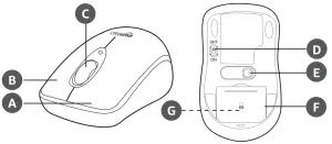 - ON/OFF switch (D): Use the ON/OFF switch to switch the mouse on and off.