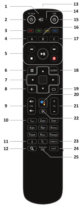 | 1. TV Input 2. TV/AUX Power 3. Color Navigation 4. ‘A’ button 5. Playback Controls 6. TV Apps 7. Navigation and OK 8. Back 9. Volume Up/Down 10. Channel select and text entry 11. Information 12. Search 13. Infra-red (IR) window | 14. Microphone 15. STB Power 16. ‘B’ Button 17. ‘C’ Button 18. Guide 19. Home 20. Voice Control 21. Channel Up/Down 22. Mute 23. Subtitles/Closed captions 24. Last Channel recall 25. Low Battery warning LED |