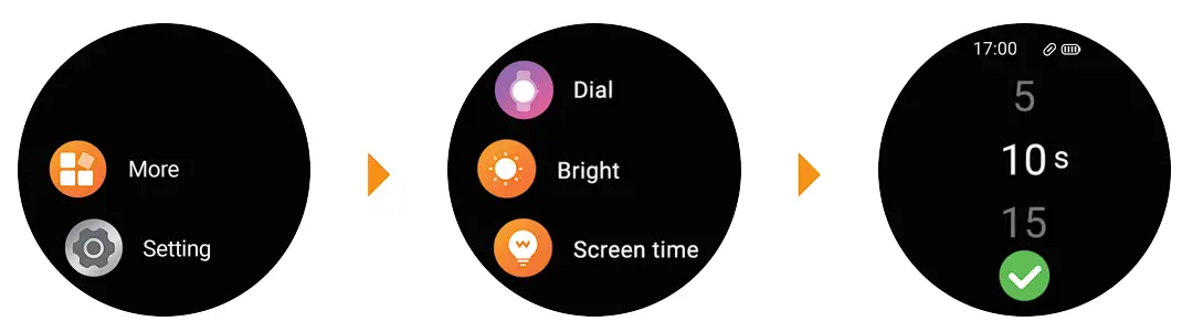 You can also set the time for the bright screen to 5s/ 1 Os/ 15s on the smart watch.