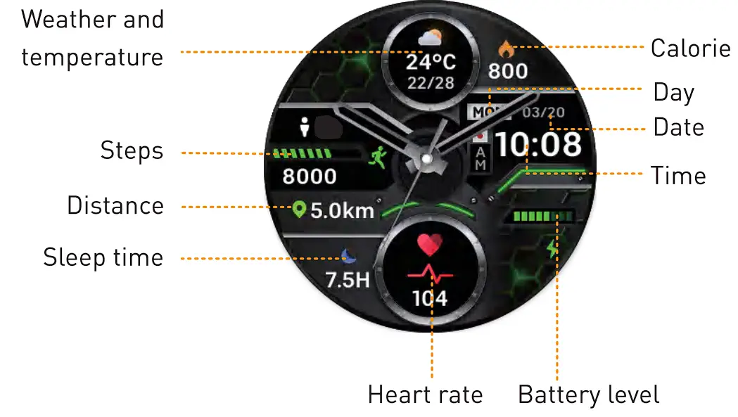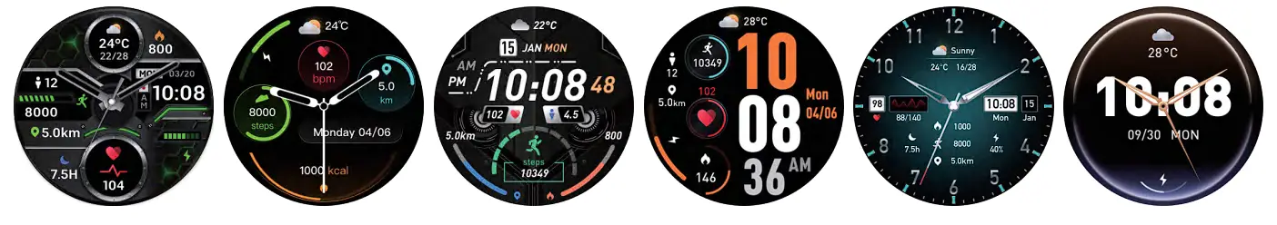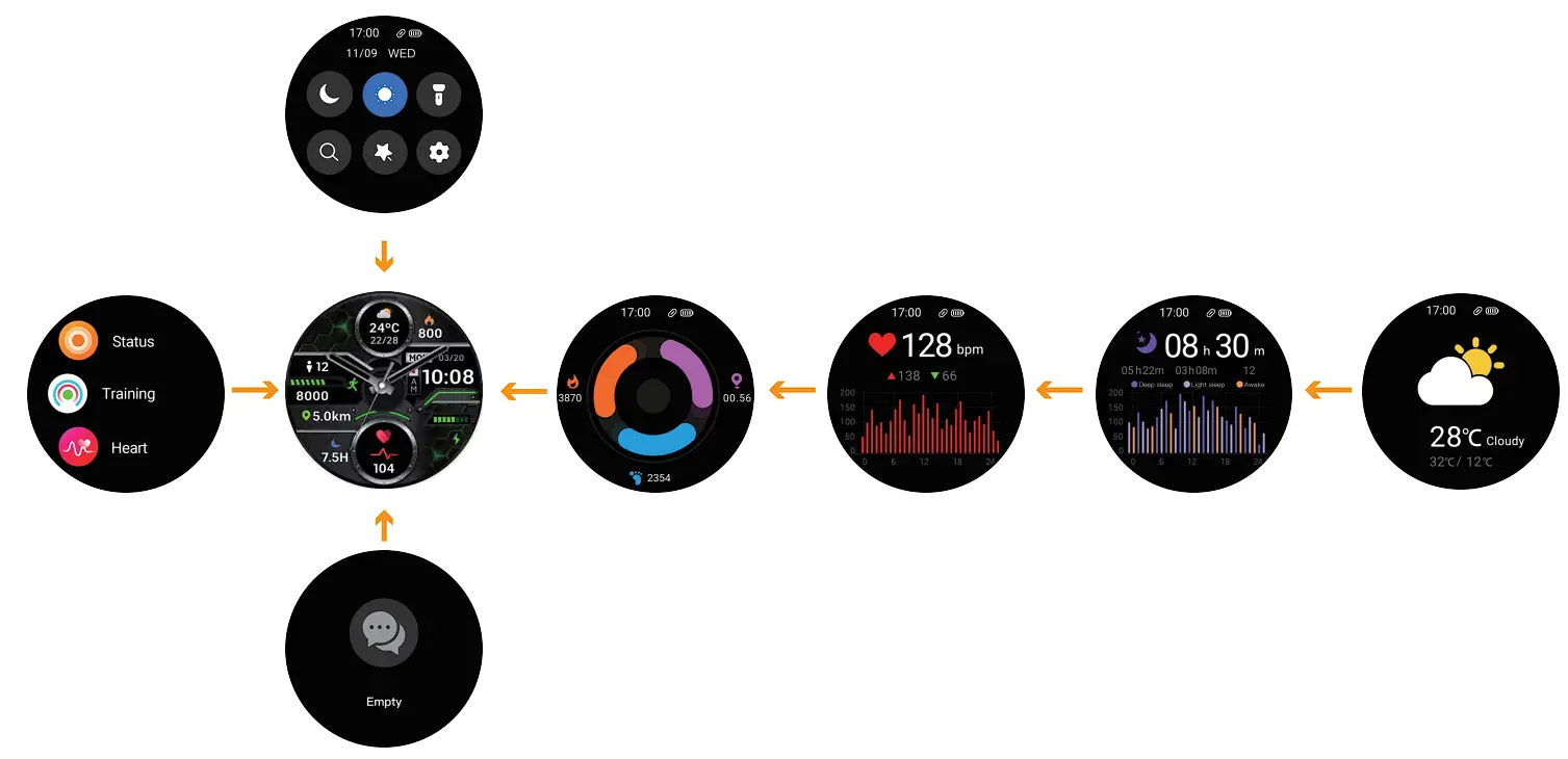 - Swipe left to see the shortcut interfaces, such as Status, Heart rate, Sleep, Weather.