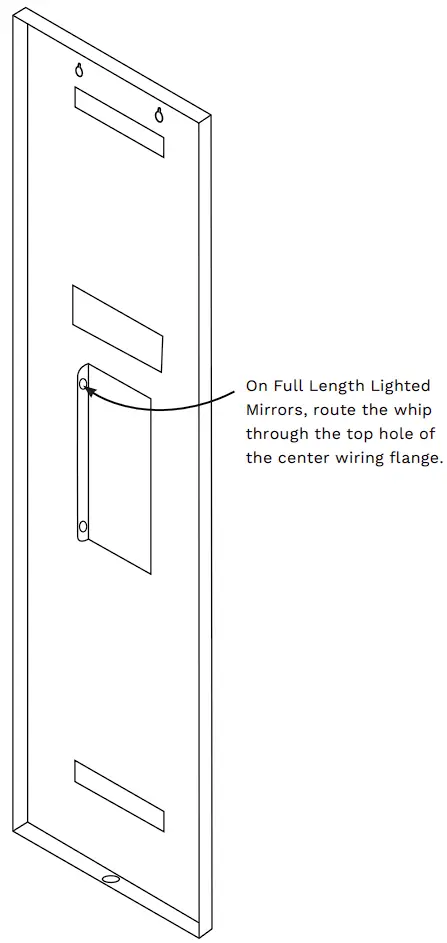 - On Full Length Lighted Mirrors, we recommend routing the whip from step 1 through the top hole of the center wiring flange and then connecting the whip to the wiring fixture disconnect. This will help keep the whip in place so it doesn’t appear behind the etched mirror glass.