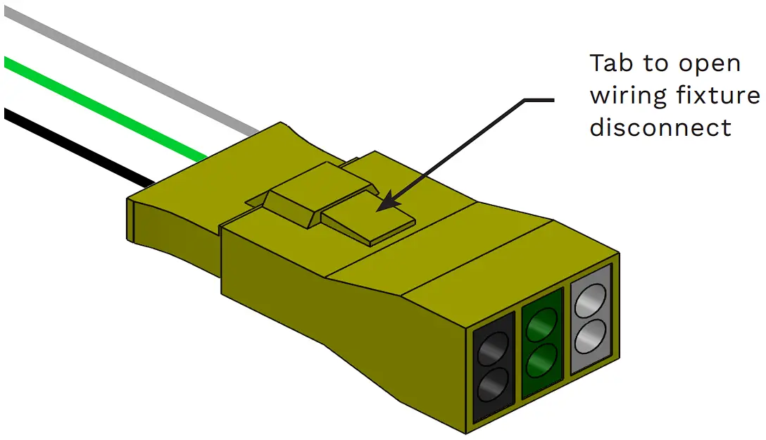 - Open the fixture disconnect by pushing down on the tab that connects the top and bottom pieces. Connect wires into the fixture disconnect using the color code diagram pictured. Reconnect the top and bottom pieces by sliding them together.
