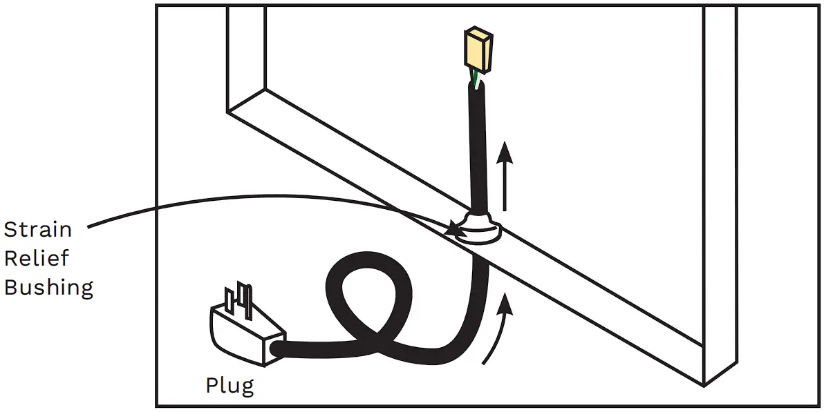 - If the outlet is located outside of the mirror housing, route the wiring fixture disconnect end of the plug cord through a hole in the bottom of the mirror housing. There is a white plastic circular piece at the bottom of the mirror housing that needs to be removed to make the hole. Then push the wiring fixture disconnect end of the cord up through the hole until the strain relief bushing on the cord blocks the hole completely – it should be a snug fit. This is a UL safety requirement. The plug end of the cord should be hanging below the mirror so you can plug it into the wall outlet.