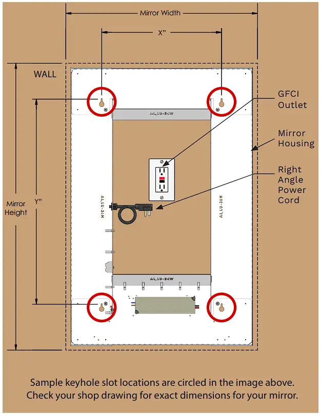 - Locate the keyhole slots on the lighted mirror housing. The number of keyhole slots depends on the mirror size. You may refer to the included drawing package for specific dimensions of your mirror and locations of the keyhole slots.