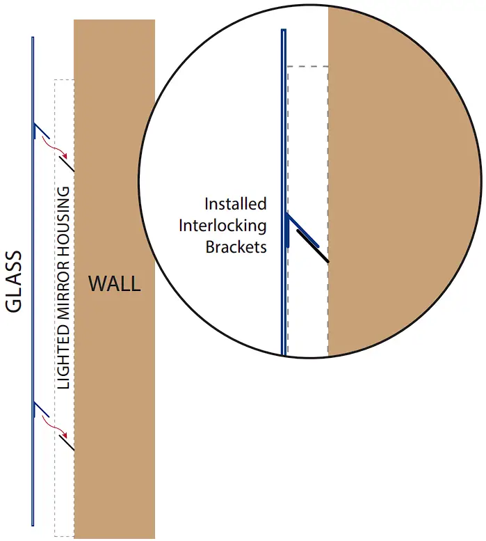 - Ensure the brackets are interlocked and the mirror is secure by making sure the mirror is level and evenly spaced from the wall. Gently try to move the mirror glass. If you can pull any of the four corners away from the housing, then it’s not mounted properly. If the glass moves, it’s likely not fully interlocked and you need to repeat this step to align the mounting brackets.