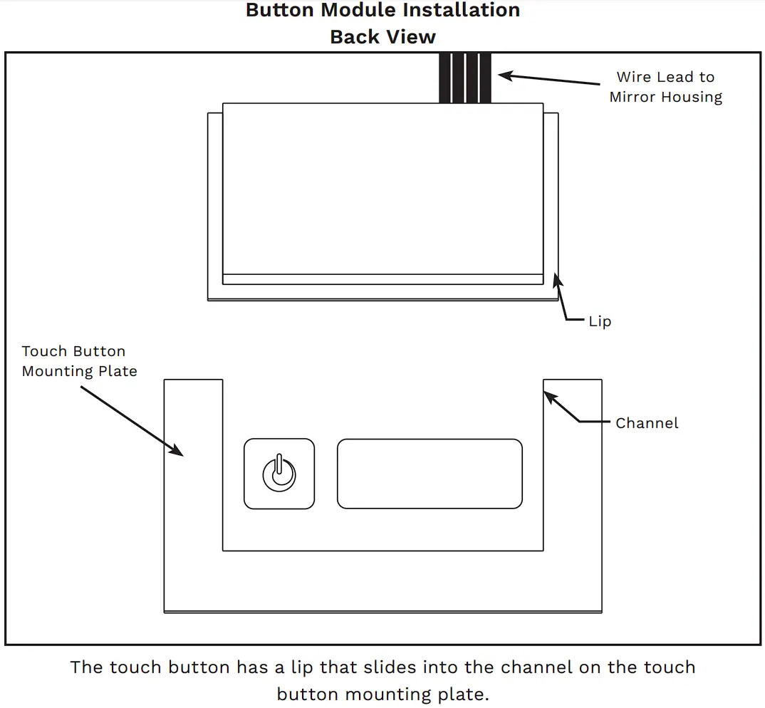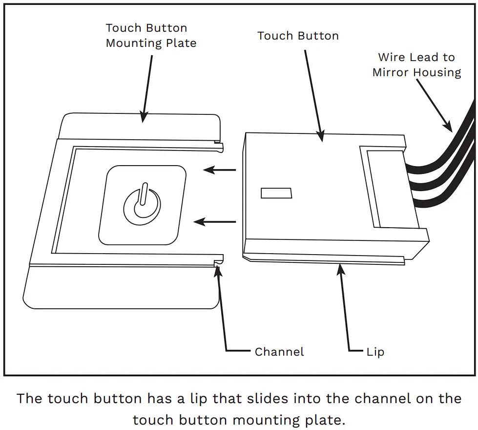 Séura’s Touch Control Dimming button comes attached to the mirror housing with a wire lead. The button icon is etched into the mirror glass and surrounded by the touch button mounting plate. Bring the mirror glass close to the mirror housing (which should already be mounted to the wall) and slide the touch button into the touch button mounting plate. The button slides from the inside of the mirror towards the edge of the mirror glass as shown. There is a channel on the button that slides into the lip on the touch button mounting plate for a secure fit. Do not use extreme force – the button should slide in smoothly.