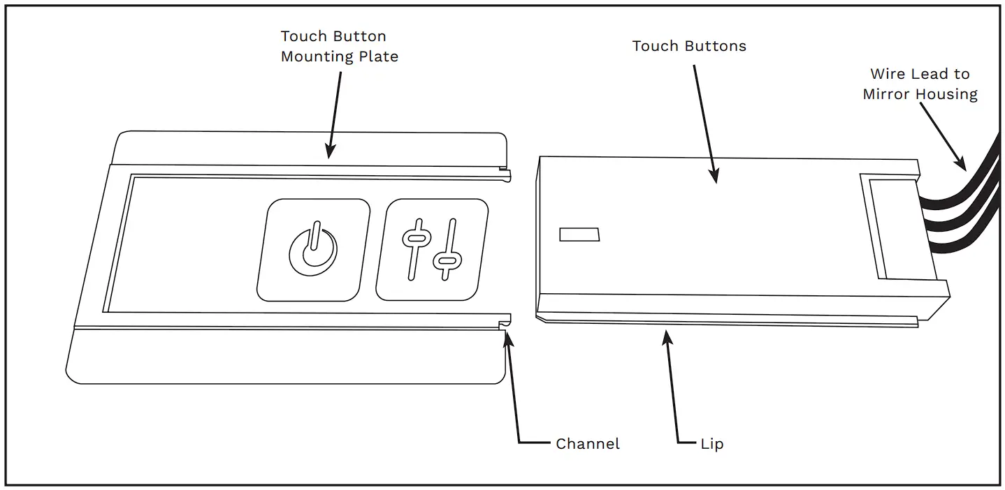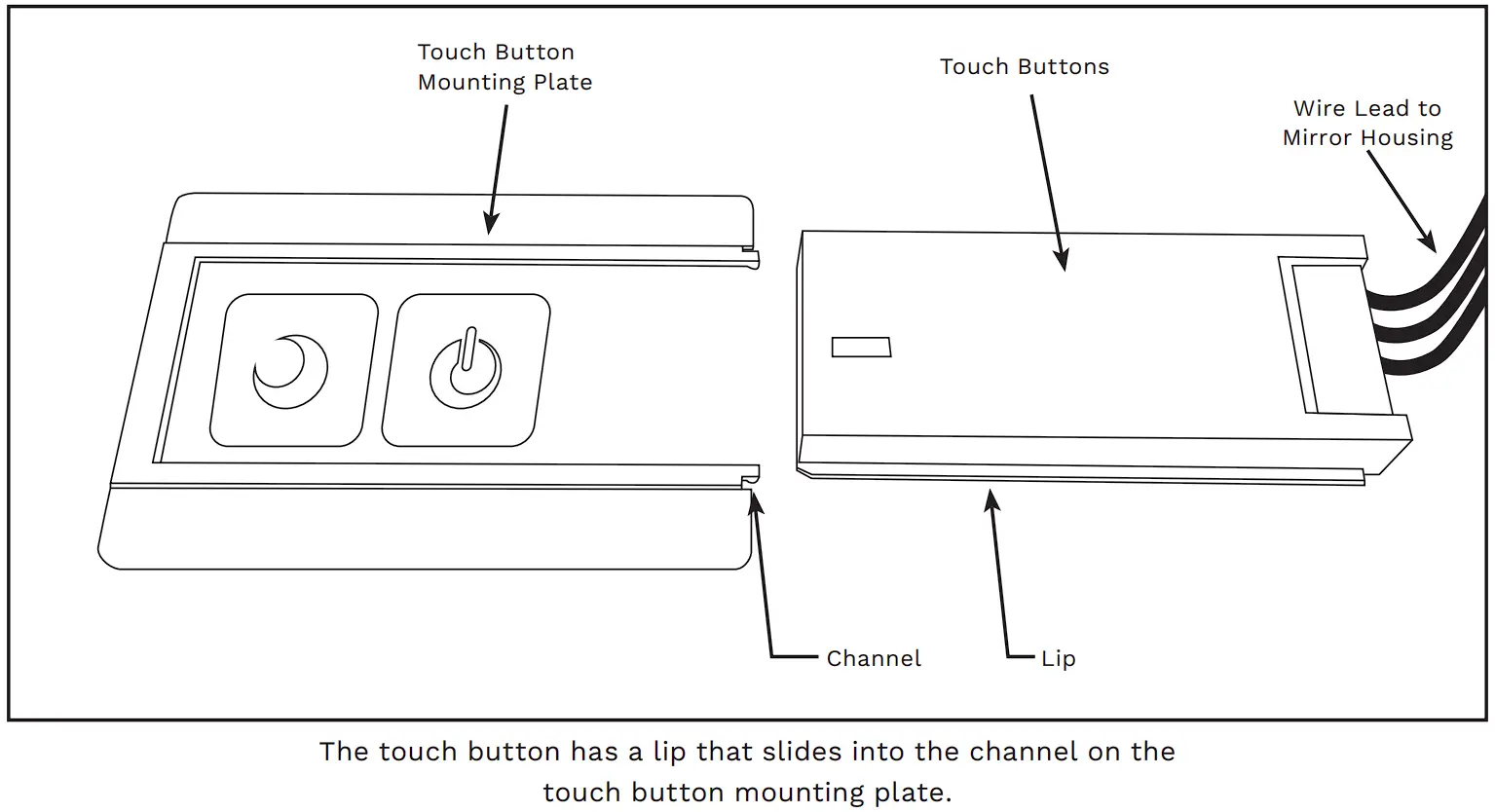 Séura’s Touch Control buttons come attached to the mirror housing with a wire lead. The button icons are etched into the mirror glass and surrounded by the touch button mounting plate. Bring the mirror glass close to the mirror housing (which should already be mounted to the wall) and slide the touch buttons into the touch button mounting plate. The buttons slide from the inside of the mirror towards the edge of the mirror glass. There is a lip on the buttons that slides into the channel on the touch button mounting plate for a secure fit. Do not use extreme force – the buttons should slide in smoothly.