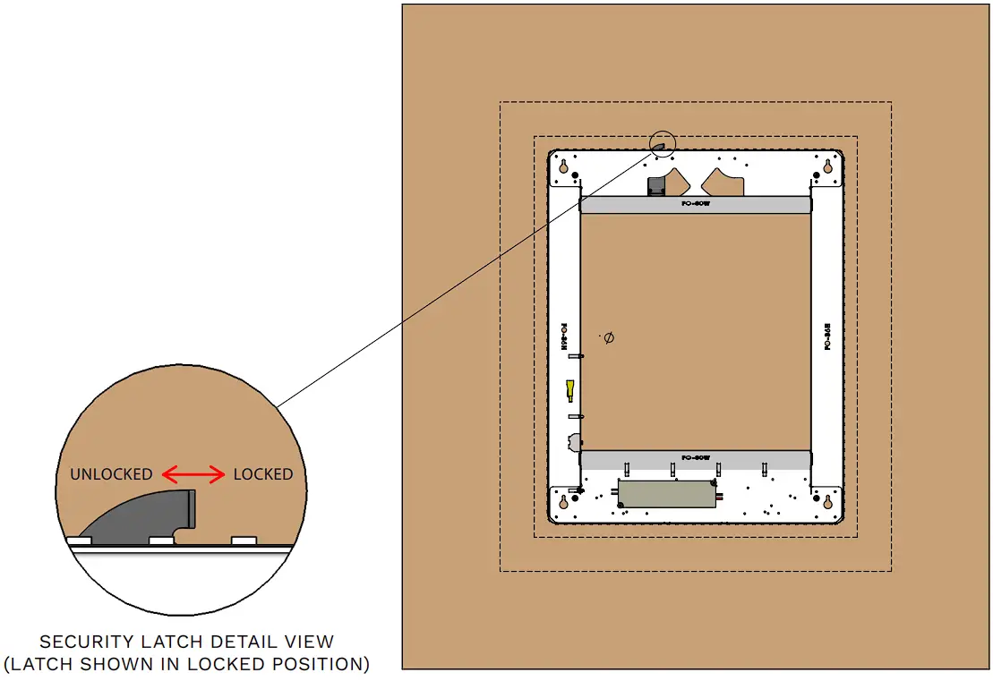 After mounting the housing to the wall and before hanging the mirror, move the security latch to the locked position.