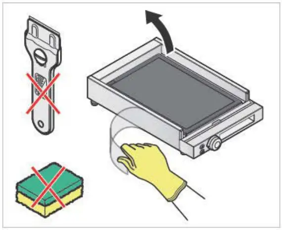 To remove any food residue, use the scraper with a rounded blade edge provided with the product. Take care when using the scraper and make sure the blade is properly in contact with the fry-top.