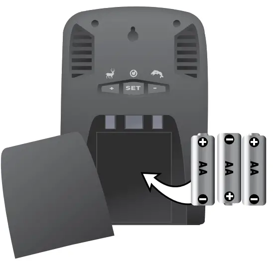 - Insert 3 x AA batteries into the battery compartment, as shown. Follow the polarity (+/-) diagram in the battery compartment.