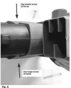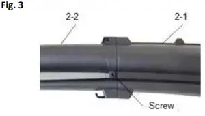 To assemble the two parts of the blower/suction tube, push tube 2-2 into tube 2-1. Then fasten with screw until they are well connected. Please see Fig. 3, and then put the assembled tube into the Blower/Vacuum body and secure with two provided screw, as illustrated in Fig. 4 with one short and one longer screw.
