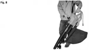 Inspect the area to be worked before starting. Remove any objects or debris that could be thrown, jammed or become entangled in the Leaf Blower Vac. Select the vacuum function using the selector lever on the side of the machine (Fig. 7) and switch on. With the Leaf Blower Vac resting on its wheels move the Leaf Blower Vac forwards directing the nozzle at the debris to be collected. Alternatively with the Leaf Blower Vac held just above the ground swing the machine from side to side, moving forwards and directing the nozzle at the debris to be collected. Do not force the nozzle into the debris as this will block the suction tube and reduce the efficiency of the machine.