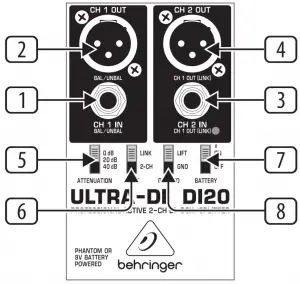 ) this connector sends the signal directly from channel 1. - The ATTENUATION dampening switch considerably increases the useful operating range of the DI20 from low signal levels of a high-impendence microphone or a guitar, all the way to the speaker connectors of a guitar amplifier (solid state). You can select between 20 and 40 dB worth of attenuation.