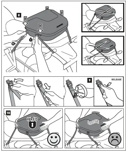 Step [8]: Attach the hook buckles of the loop straps [11 I on both sides to the marked loops of the top case [1 I. as shown in the drawing. Tighten all loop straps until the top case [1) is centered and securely fastened to the vehicle.