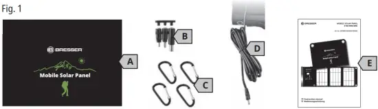 Through the eyelets (Fig. 2, 4), the panel bag can be secured with the snap hooks (Fig. 1, D) must be fixed in a suitable place if necessary. - The solar panel is ready for use.