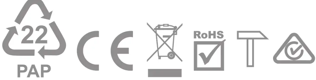 ![]() | Input: 100-240V AC 50/60Hz Output: 5V DC 1A | ![]() |