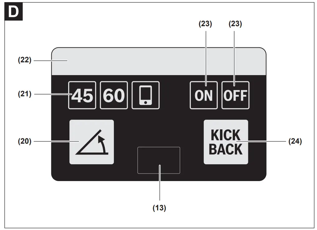 The rapid shut-off function can be deactivated on the user interface (14) with the button (24). If the power tool is not used for longer than 5 minutes or if the rechargeable battery is removed, the rapid shut-off function automatically switches back on. The current status is shown via the LED for KickBack Control (23) on the user interface (14). Please note that the warning light is not visible from all directions. The warning light is difficult to see in bright sunlight.