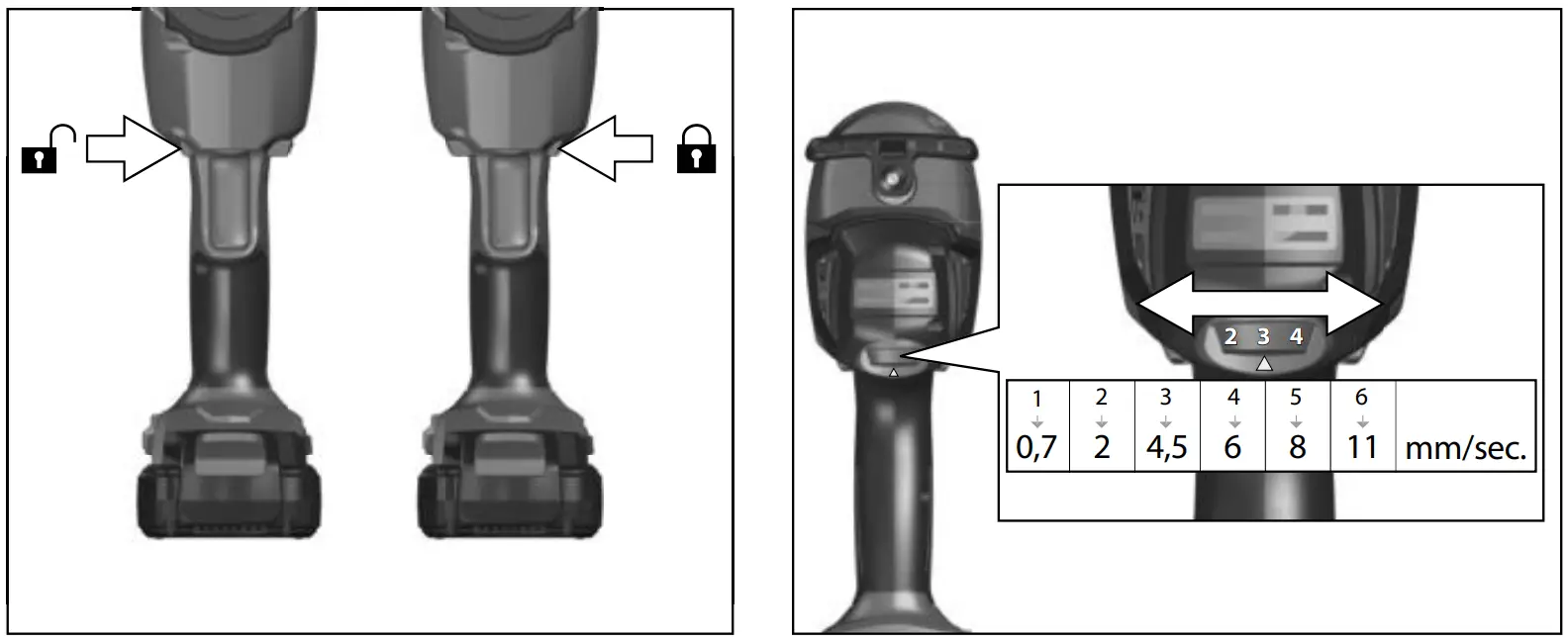 | Feed rate | 0,7 | 2 | 4,5 | 6 | 8 | 11 mm/Sek. |
