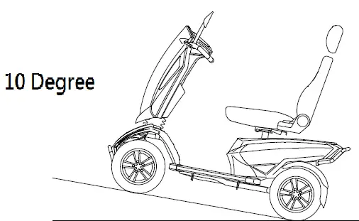 Warning! Do not, under any circumstance, climb a slope greater than the maximum climbing angle (10 degree) with this power scooter. Any attempt to climb a slope steeper/greater than 10 degree may put your power scooter in an unstable position and cause it to tip. When on any sort of an incline or decline slope, never place the power scooter in freewheel mode