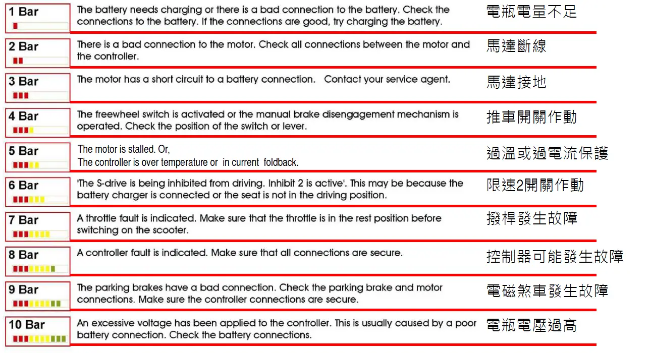 PG S-Drive controller: PG D-Drive Controller continuously monitors the operating conditions of your scooter. If it detects a problem it will indicate with error message by flashing light. You must count the number of the flash, and see the list to check what kind of error has happened according to the number) S-Drive Controller – Troubleshooting