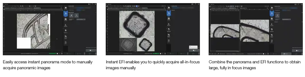 The extended focal imaging (EFI) function enables you to obtain fully in-focus images by serially acquiring multiple images at different focal planes. The panorama function enables you to acquire images larger than the microscope’s field of view by moving the stage across the sample. Using PRECiV software, you can now combine the instant EFI and panorama functions while keeping both hands on the microscope. A colored frame indicator shows the quality of each image being stitched together, while a split screen shows the live image and stitched image side by side.