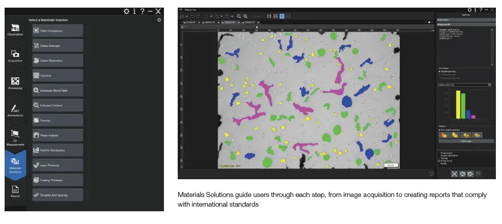 Don’t compromise by using software designed for life science or other non-industrial applications. PRECiV™ software is designed to work the way that you do with optional Materials Solutions that will guide you through a succession of steps—from image acquisition to standard compliant measurements and reports—in most popular materials science applications.