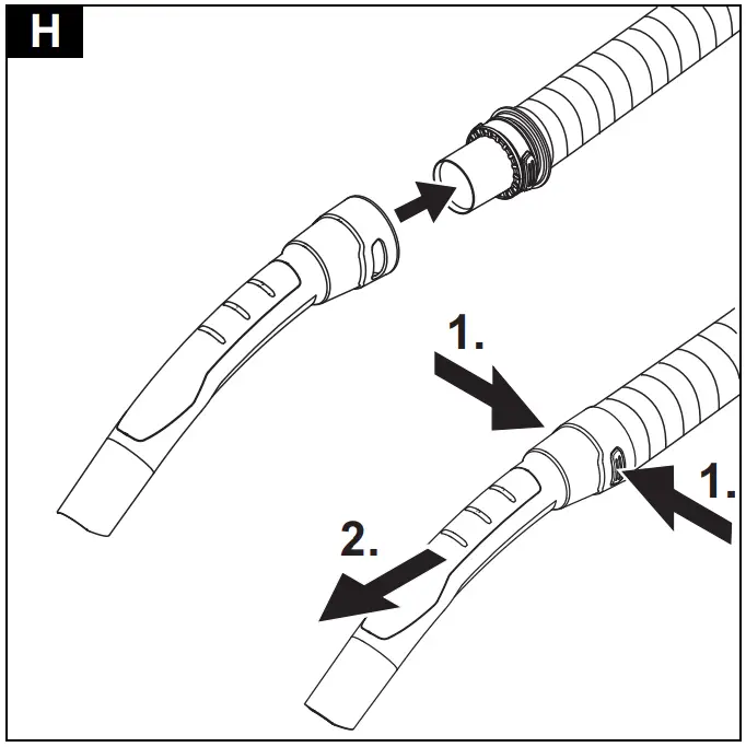 To release the handle, the grey areas on both sides of the handle must be pressed, and the handle pulled from the hose. - Install the floor nozzle.