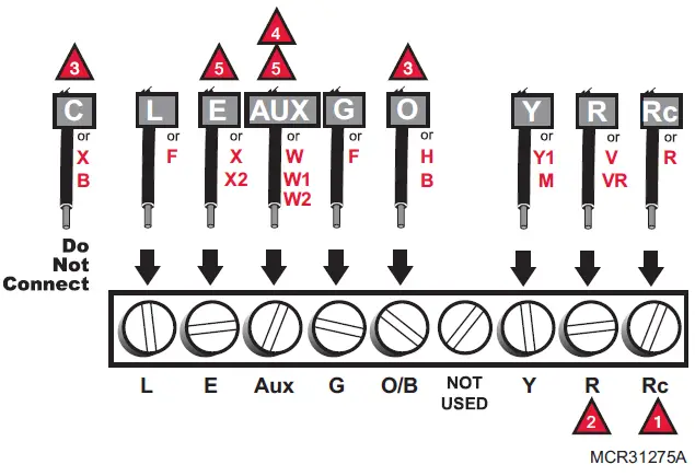 If labels do not match letters on the thermostat, check the chart below and connect to terminal as shown here (see notes, below).